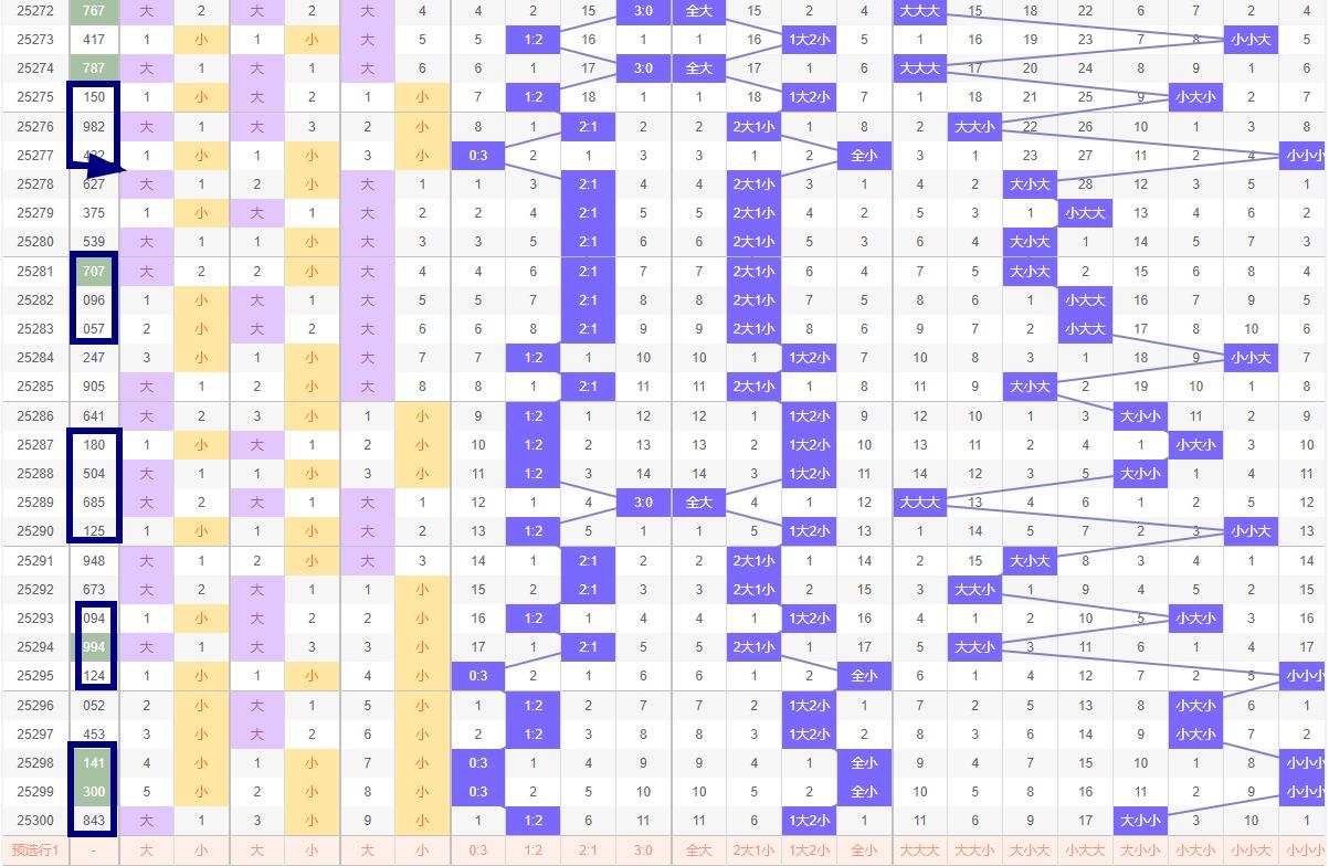 大小走势分析: 在排列3/的大小走势中,近期数据显示大小组合分布较为均衡,但细致观察历史数据,发现大小组合呈现出一定的周期性变化。因此,对于第301.期预测大小比例可能为1:2或2:1。考虑到近期小号略有增多,建议重点关注大小比例为2:1的组合,即一个小号搭配二个大号;近十期大小比为10:20.