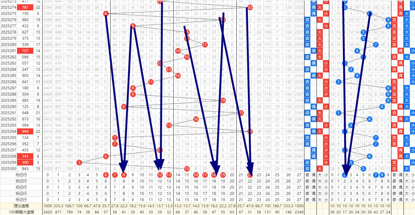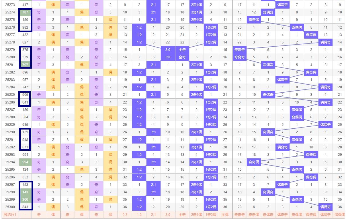 奇偶比例预判 在奇偶比例方面,第300期开出了843偶偶奇的组合,显示出偶数号码的强势。然而,根据奇偶比例的自然平衡原理,奇数号码在第301期有望得到更多的关注。因此,301期的奇偶比例可能为2:1,即奇数号码占据多数。这种预判基于对历史数据的深入分析,以及对奇偶比例波动规律的把握。近十期的奇偶比为14:16基本保持平衡。