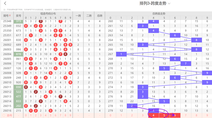 4、跨度走势情况:通过定位的方式的缺点就是得到的号码较多,组合比较困难,可以通过跨度本身的走势情况预估跨度值,再通过跨度指标进行过滤缩水,增加成功率,但跨度如果不能准确预估,反而容易出错,建议谨慎使用。近期跨度走势如下图所示: