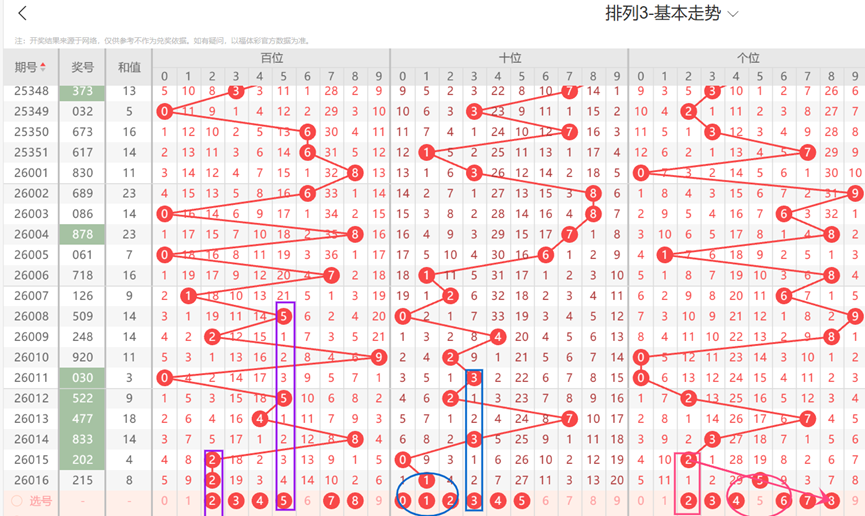 上一期百位开出号码为2,为偶数、小数、质数、2路号码:近10期百位01等号码较少出号,本期百位开出01等号码的可能性小,因此本期百位选号时应该考虑01以外的号码,结合上述走势图看,本期百位看好234578等号码。