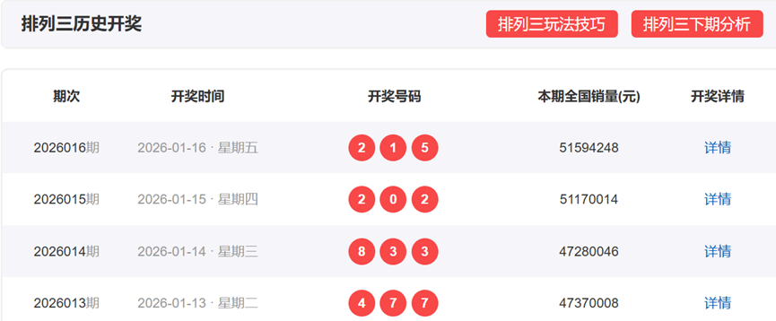 体彩排列3上一期,开奖号码为215,形态为组六,奇偶比为2:1,012路数值表现为212,和值08,和尾8,跨度4。