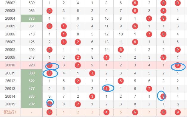 上图是体彩排列三开奖号码分布走势图,我在上面标注出来的数字都是合数04689,你们看我在上面走势图中标注出来的蓝色小圈圈表示的都是合数,最近几期开出的合数个数太少了,连续4期开奖号码中都是质数多,合数少的组合,那么本期个人观点就是合数04689至少得开一个或者2个吧。