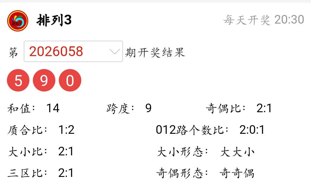 排列3上期(2026058)开奖号码详情