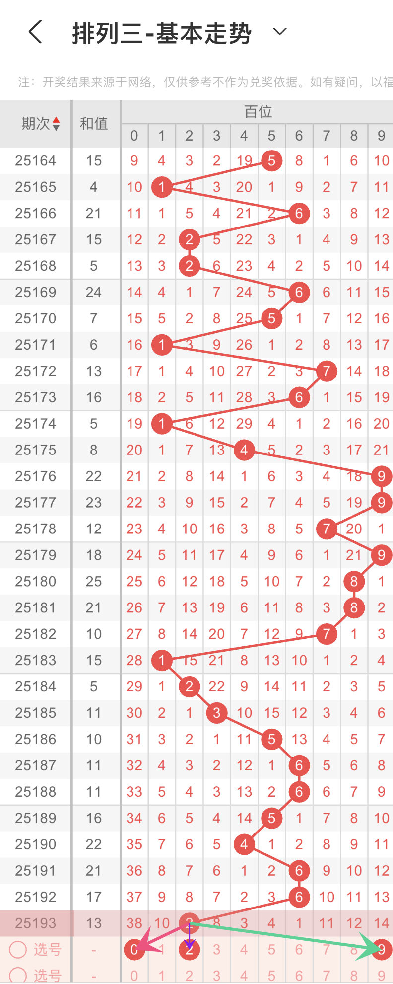 结合上面的大小、奇偶以及012路比,我们可以得到的数据分别是第一组01234,第二组02468,第3组0258,我们重点选择3组数据中重复的,那百位我们选择02,防0路的9,综上所述百位选029