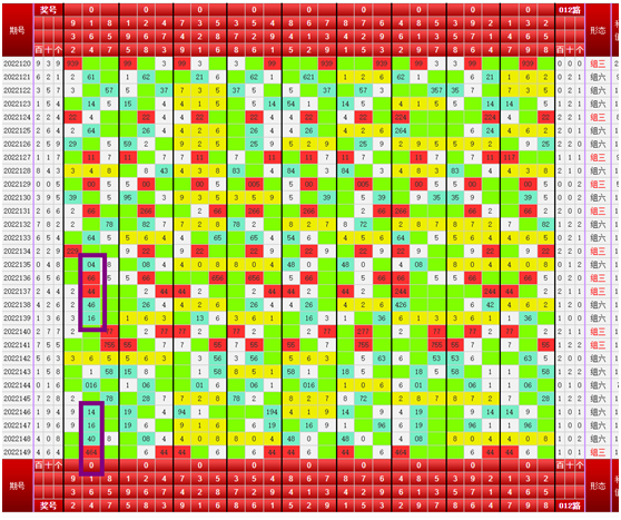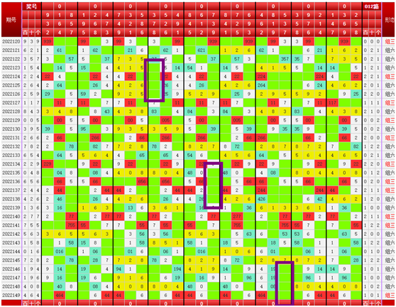 排三九宫图里一共有几种情况,第一是号码连出情况,比如我们上图显示的数据,我们已经用颜色给标出,比如135期排三开奖048到139期排三开奖133,我们可以看到这个纵列是属于号码1、4、6所在的纵列,从135期到139期连续5期都有号码出现,此时又可以看到从146期到149期连续4期又有号码体现,那么此时我们就得到了一个疑问。