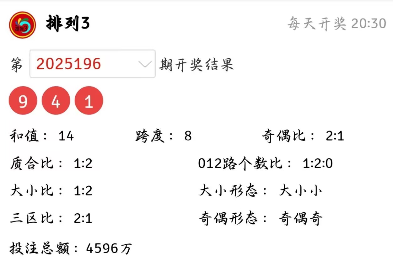 排列3上期开出两奇一偶三个数9、4、1,跨度:8,和值:14,奇偶比:2:1,质合比:1:2,大小形态:大小小,三区比:2:1, 012路个数比:1:2:0