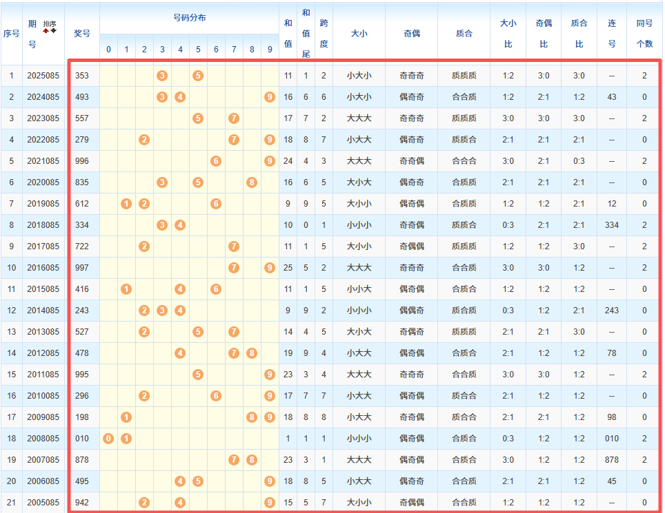 1、统计往年同期开奖号码