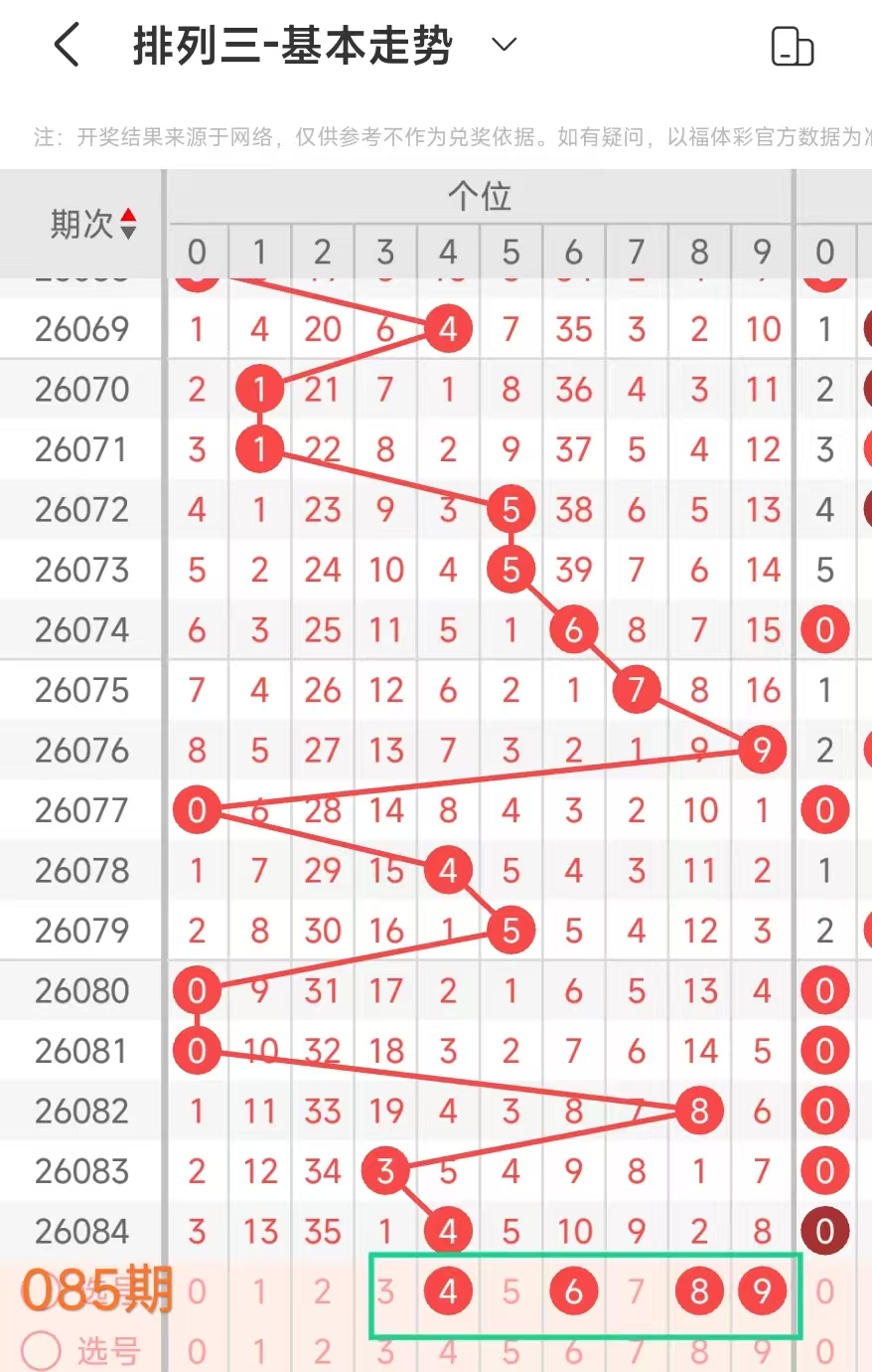 经统计0号出现1次、1号出现4次、2号出现7次、3号出现5次、4号出现7次、5号出6次、6号出现4次、7号出7次、8号出现4次、9号出现9次.统计后出现次数靠前的数字作为我们的备选号码.其号码有24679等