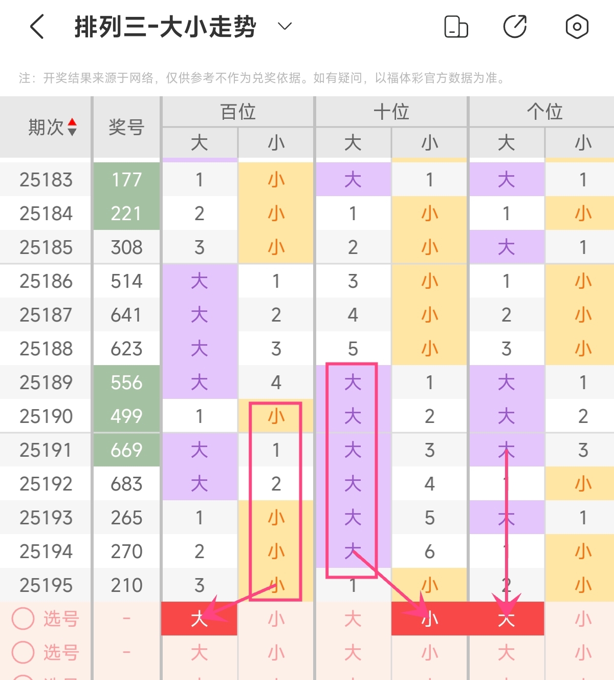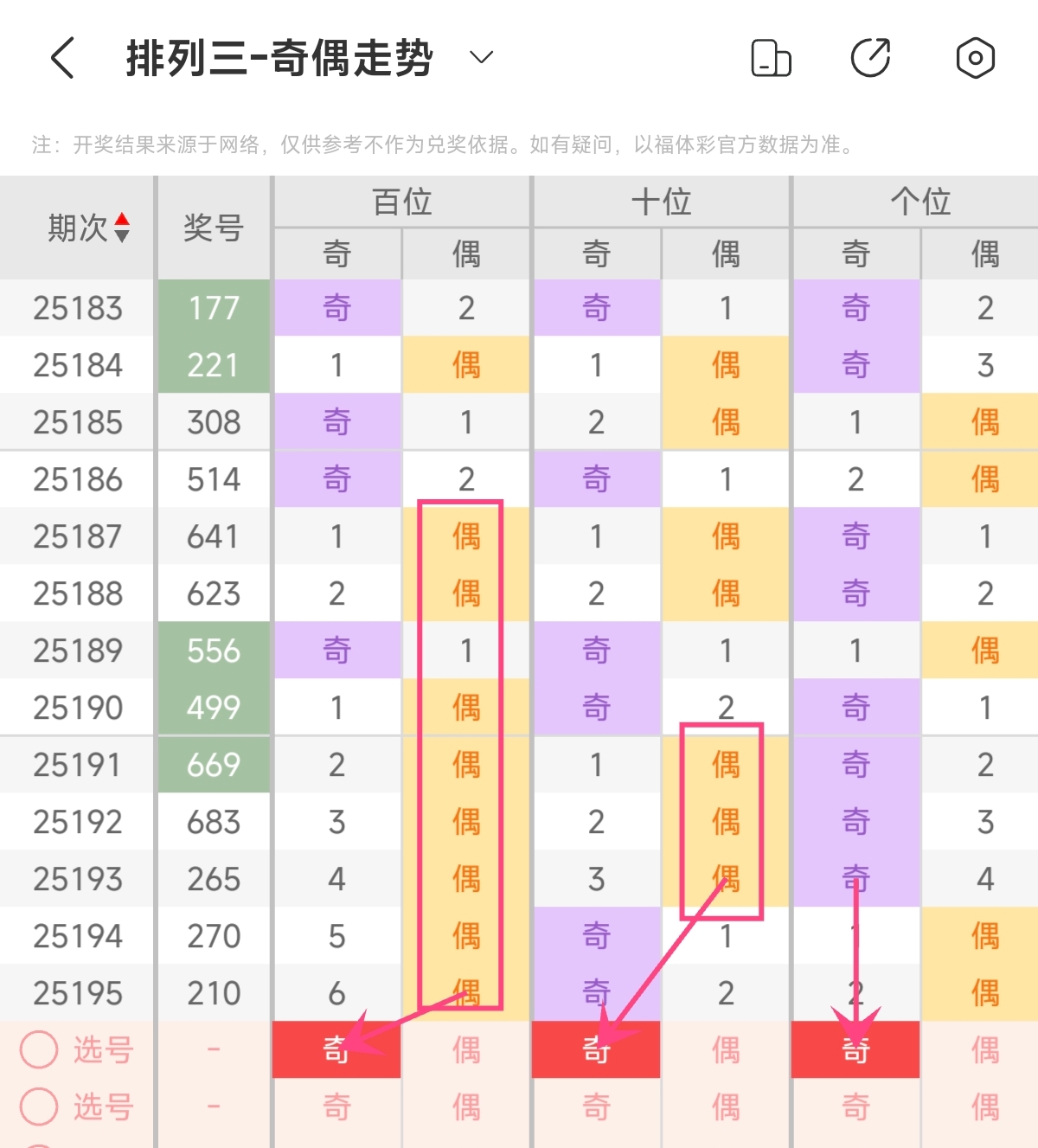 首先让我们回顾一下上期排列3第2025195期开奖号码为210,为组六形态,大小比为0:3,奇偶比为1:2,和值为3,跨度为2。
