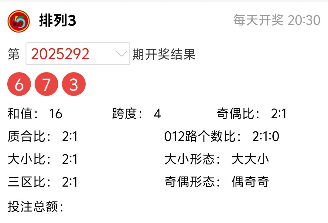 排列3上期(2025292期)开奖号码详情