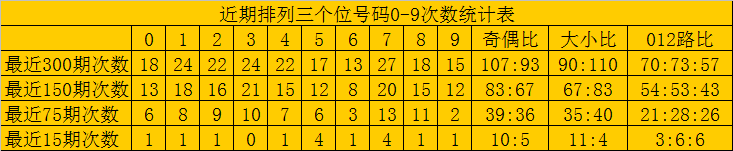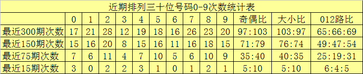 最近15期奖号由冷到热表现为:3→0次,0、1、2、4、6、8、9→1次,5、7→4次,奖号奇偶比为10:5,大小比为11:4,012路比为3:6:6。