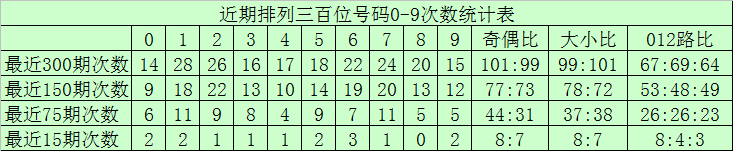 百位分析:最近300期奖号由冷到热表现为:0→17次,4→25次,5→28次,9→29次,3、8→30次,6→33次,2→34次,7→36次,1→38次,奖号奇偶比为161:139,大小比为156:144,012路比为109:99:92。