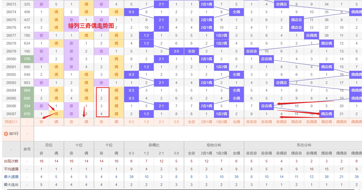 排列三 奇偶分析:从上图可以看出排列三100期内百位奇偶比约为48比52,十位奇偶比为53比47,个位奇偶比为55比45,百位的比值比较均衡,但是百位的比值偏差就有点大,历史奇偶形态近2期开出偶奇偶后下一期的走势为,第002期开出偶奇偶后003期开偶奇奇, 第017期开出偶奇偶后第018期开偶偶奇,第034期开出偶奇偶后第035期开奇奇奇,近期排列三奇偶走势来看,奇奇奇组合表现极为活跃,连续或密集开出,属于典型的热号范畴,热号往往具备越热越出的惯性特征,短期内仍有继续连下的可能,需作为重点关注对象;与此同时,偶奇奇组合则处于温和上升阶段,近期出现频率有所增加,有逐步转热的明显迹象,从形态轮动的规律分析,温号在积蓄一定热度后往往容易迎来加速走热的过程,同样不可忽视。所以排列三2026088期奇偶形态推偶奇奇与奇奇奇。