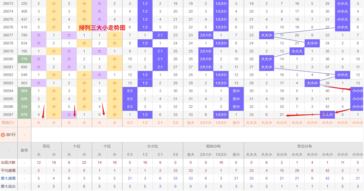 排列三 大小形态分析:从大小走势图上可以看出排列三100期内百位大小比约为48比52,十位大小比约为46:54,个位大小比约为51比49,除了个位奇数比偶数多,十位和百位偶数比奇数多。历史数据近2期开出小大小下一期的走势为,第008期开小大小后第009期开小大大。第014期开出小大小后第015期继续开小大小,第034期开出小大小后035期开大大大。近期排列三大小走势来看,“小大小”组合虽然刚刚开出,但在此之前经历了较长时间的遗漏,属于典型的冷态反弹形态,冷号在首次回补后往往具备较强的延续性,容易形成连下势头,接下来需重点关注其继续出现的可能;与此同时,“小大大”组合则仍处于明显的冷态区域,遗漏多期未出,远超平均间隔,从号码回归的周期性规律分析,冷号在积累较大遗漏幅度后往往会逐步进入回补敏感期,同样需要作为重点防守对象。所以排列三第2026088期大小形态推荐小大大防小大小。