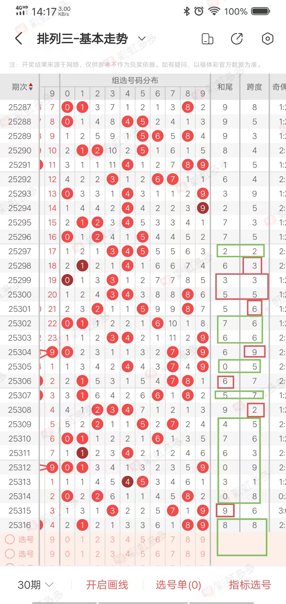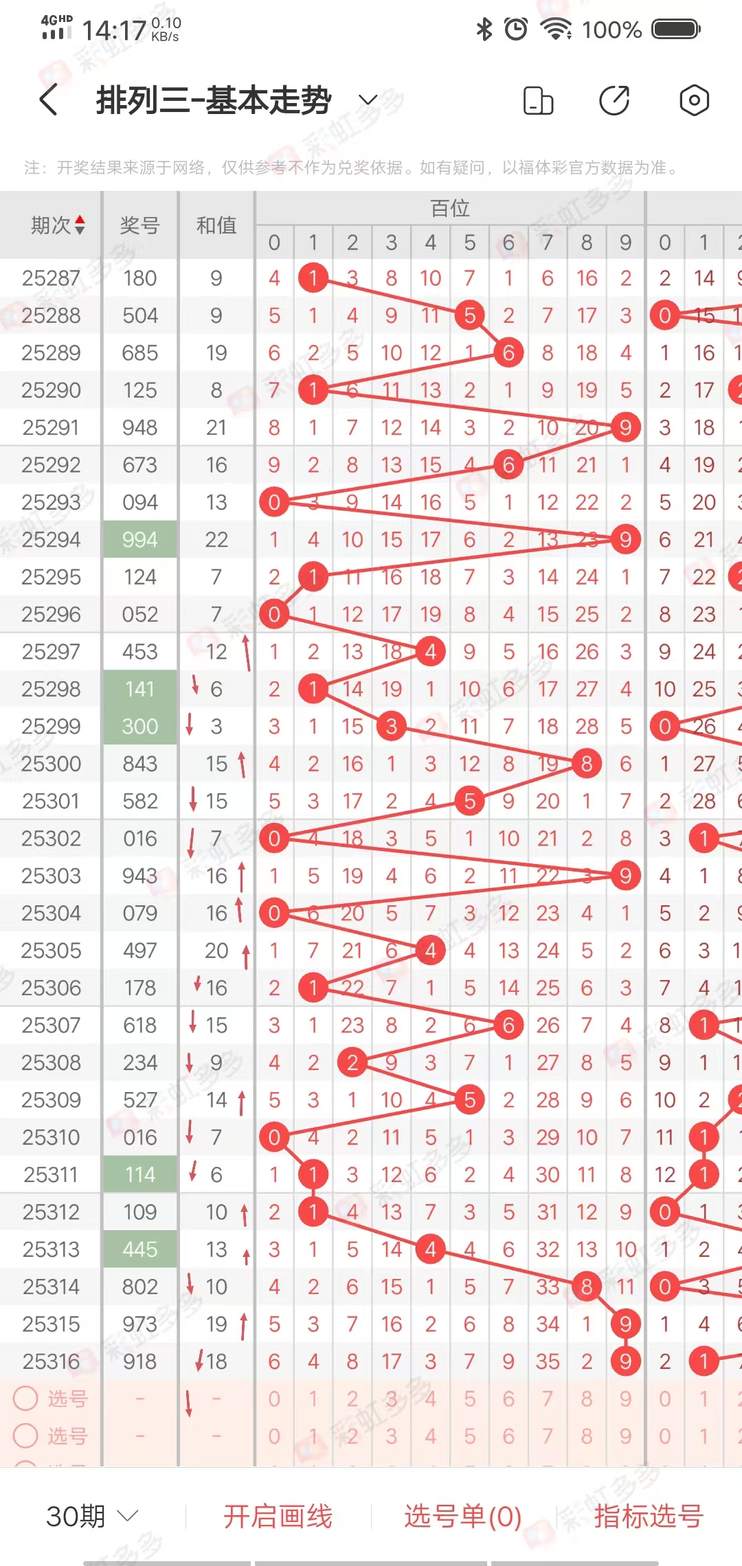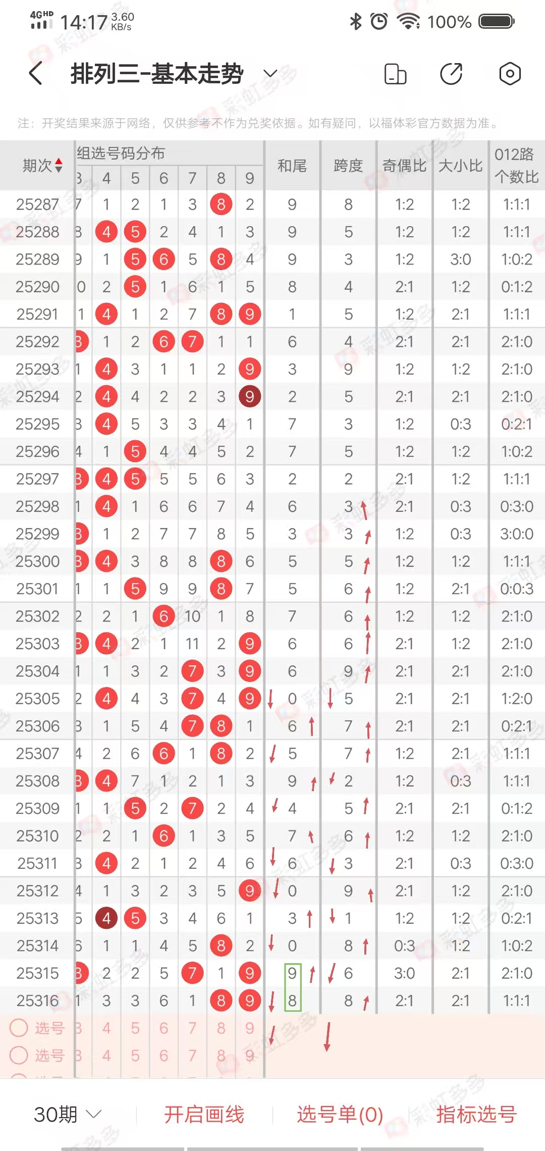 从走势图可以看出,近期幅度-3➕12-0-8➕9➕0➕4-4-1-6➕5-7-1➕4➕3-3➕9-1,上下幅度12左右,近10期有连续上下走势,上期小幅度下降,本期走继续下降走势,综合和值在8-17之间,