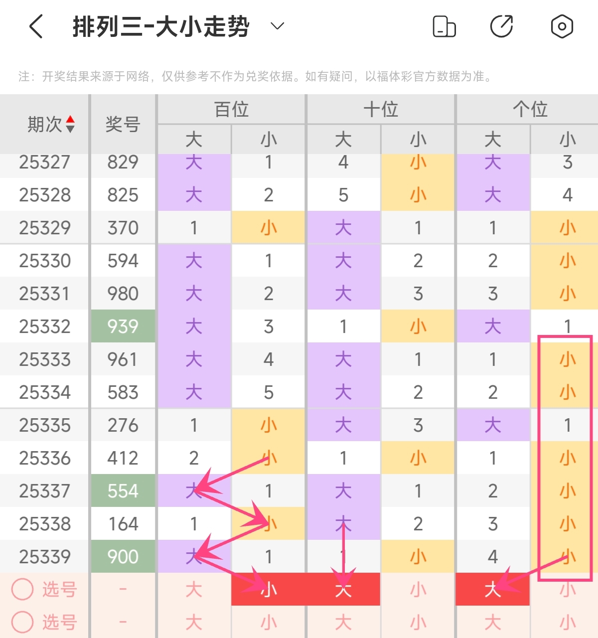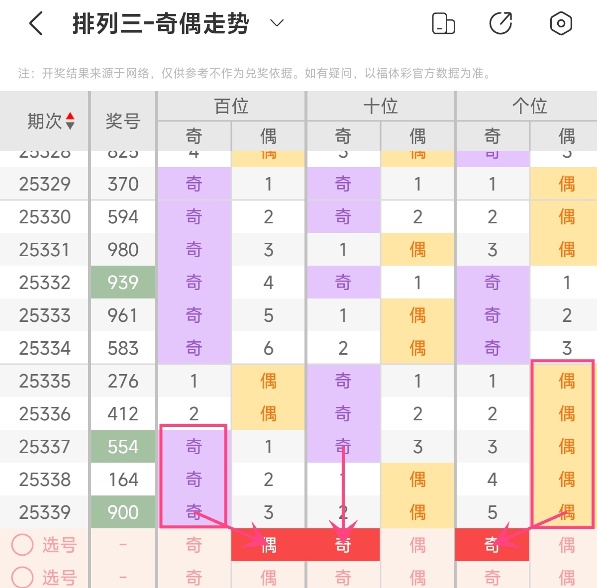 首先让我们回顾一下上期排列三第2025339期开奖号码为900,为组三形态,大小比为1:2,奇偶比为1:2,跨度为9,和值为9。
