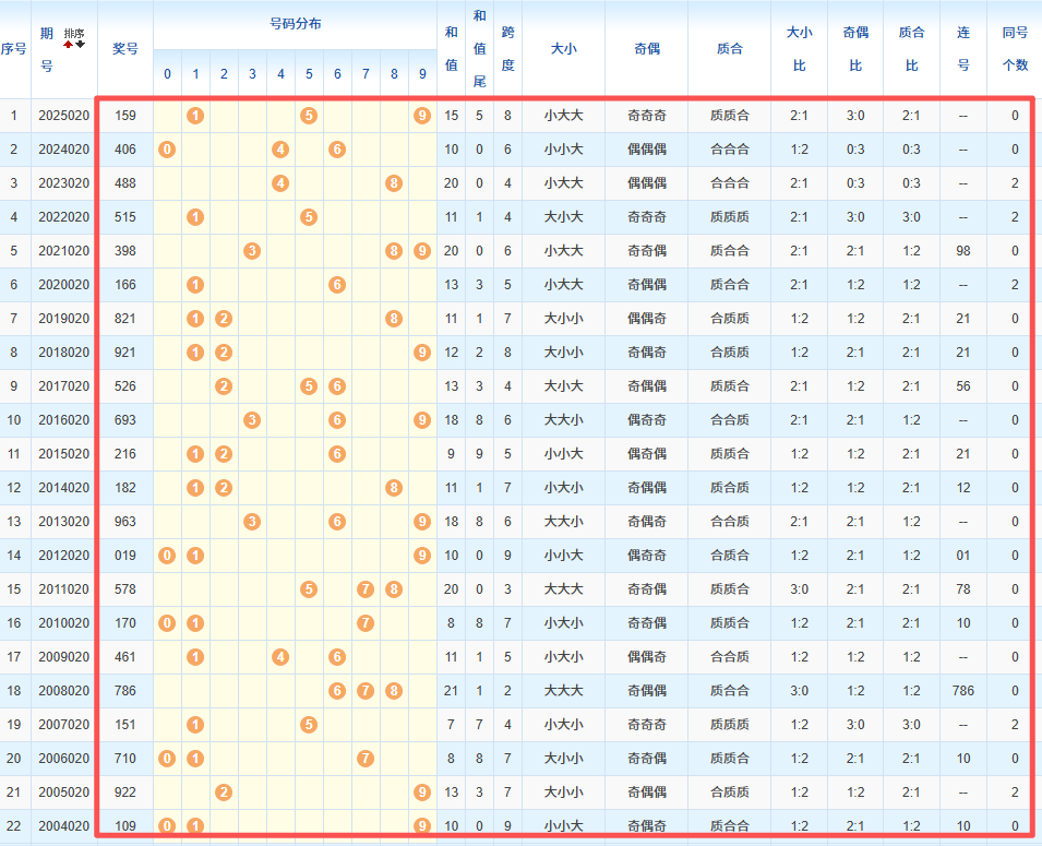 1、统计往年同期开奖号码