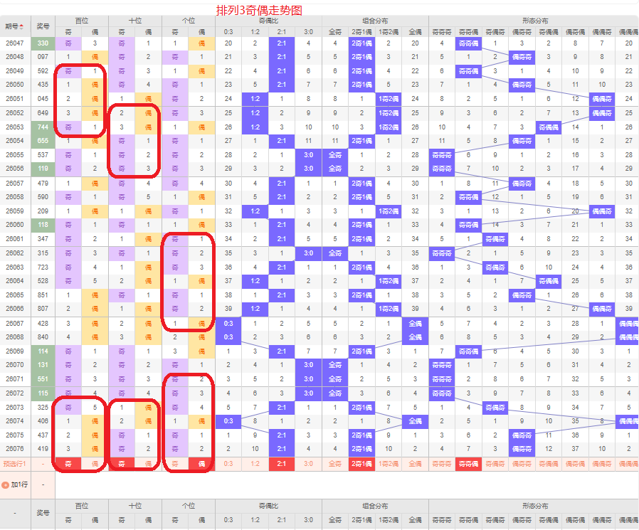 上一期的奇偶比为2:1,两奇的号码组合,从近五期的奇偶数出现情况看,奇数出9次,偶数出现6次,奇数号码出现较多,本期要侧重两奇的号码组合,侧重奇奇偶或偶奇奇的号码组合,根据奇偶组合形态可做五码定位13579/13579/02468或02468/13579/13579