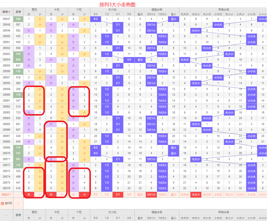 上一期大小比为1:2,两小的号码组合,近五期大号出5次,小号出10次,大号码出现较少,上一期是两小的号码组合,本期侧重两大的号码组合,百位侧重大号码,十位侧重大号码,个位侧重小号码,侧重大大小或者大小大的号码组合,根据大小形态五码定位56789/56789/01234或者56789/01234/56789
