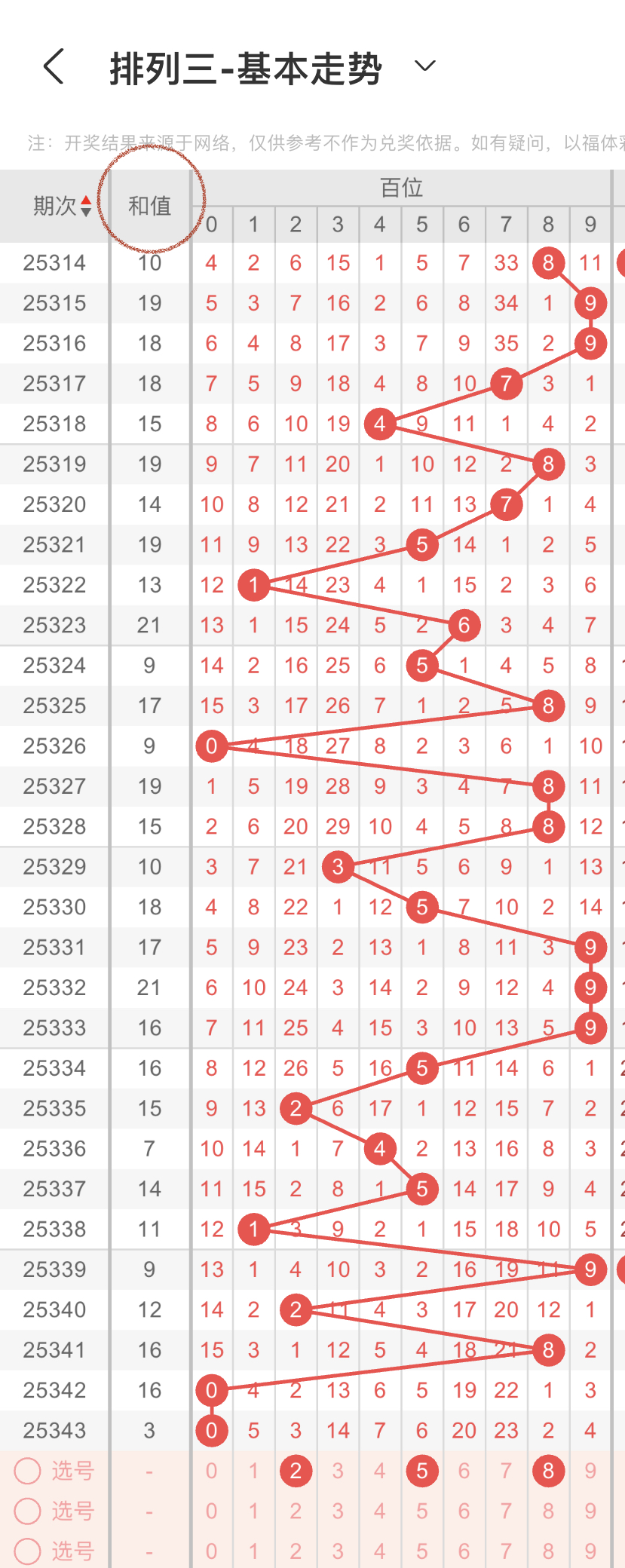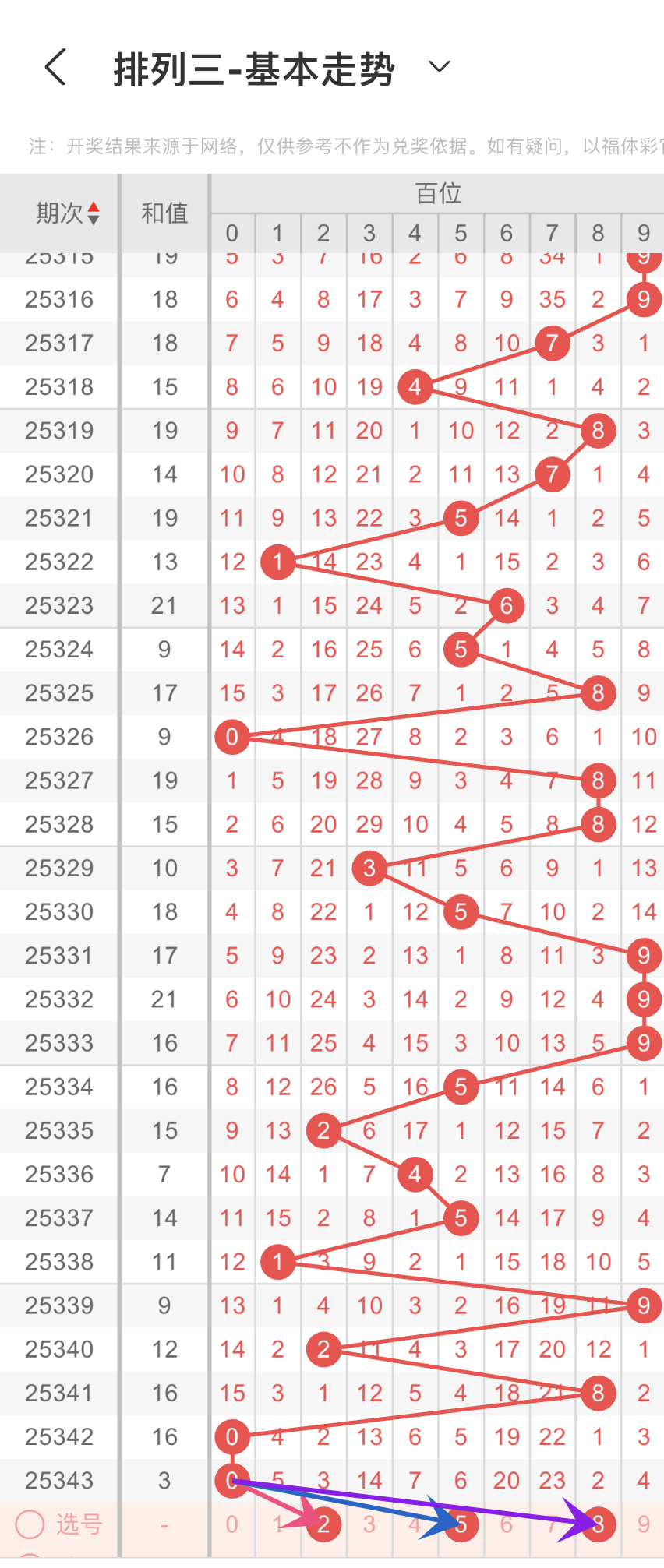 结合上面的大小、奇偶以及012路比,我们可以得到的数据分别是第一组56789,第二组02468,第三组258,我们重点选择3组数据中重复的,那百位我们选择8,防2路的25,综上所述百位选258
