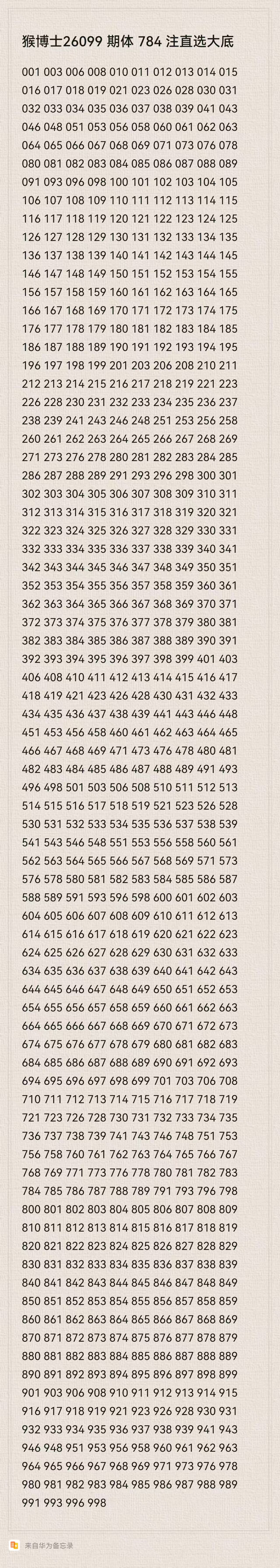 猴博士26099期排列三784注直选大底:(可以当母底用,然后进行缩水)