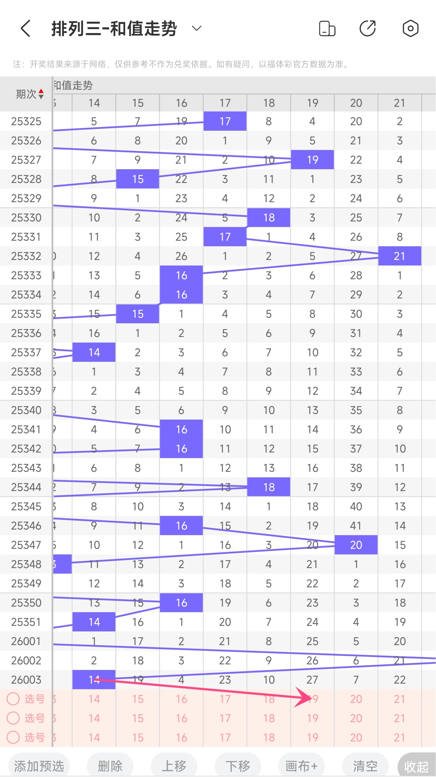 上期和值为14,往前一期和值为23,趋势往左移动,偏移量为9。通过走势图分析,14和值是近30期内开出中间偏小的和值,下降空间比较小,上升空间比较大。本期看好和值变大,因此推测本期趋势是往右的,和值会变大,小概率往左,和值变小。
