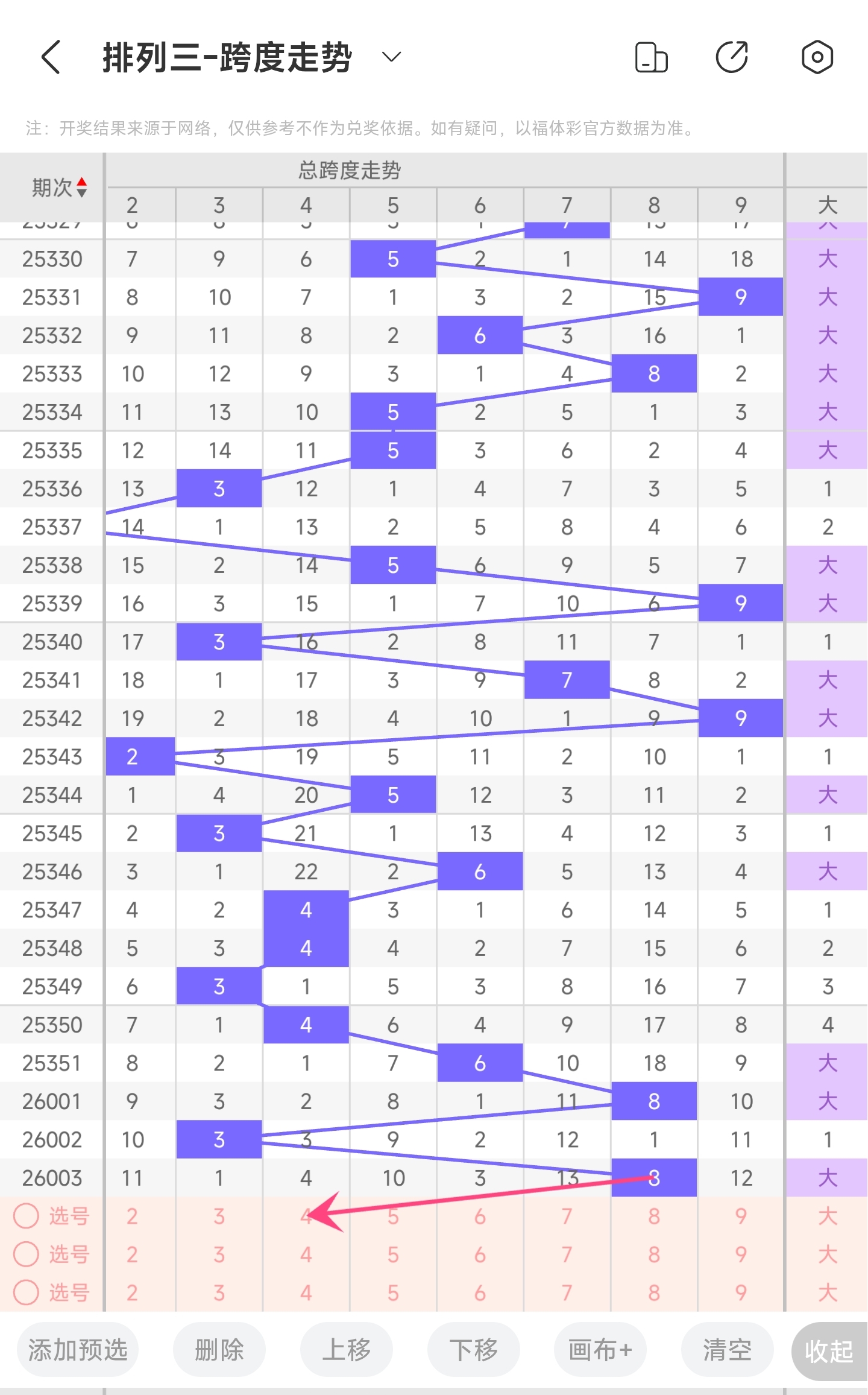 上期跨度为8,往前一期跨度是3,趋势往右移动,偏移量为5。跨度值8时,跨度值是近30期内开出比较大的值。通过走势图分析,目前的趋势是大概率往左,小概率往右。所以推测本期跨度可能为23456等跨度。