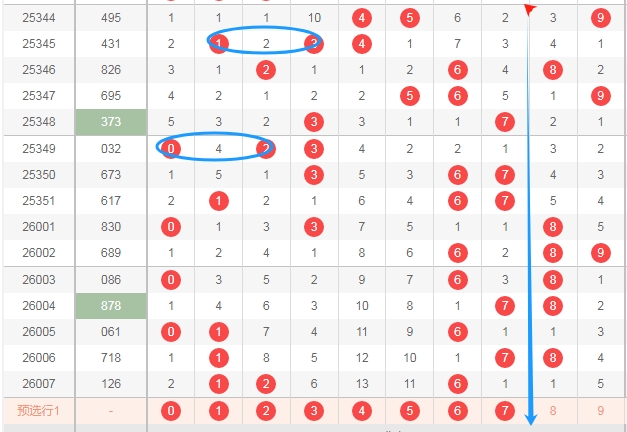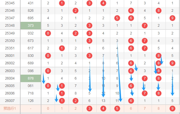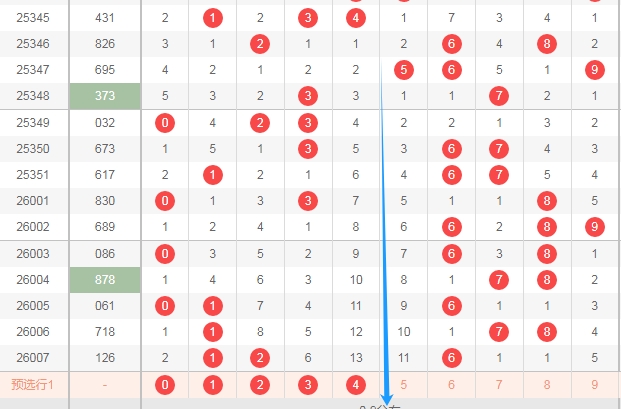 上图是体彩排列三开奖号码分布走势图,我在上面走势图中标注出来的数字0 1 2 3 4这几个数字,本期个人觉得应该得关注出1个或者2个,因为你们看上面蓝色箭头的右边出号码多,那么本期左边的数字0 1 2 3 4得关注出1个或者2个。