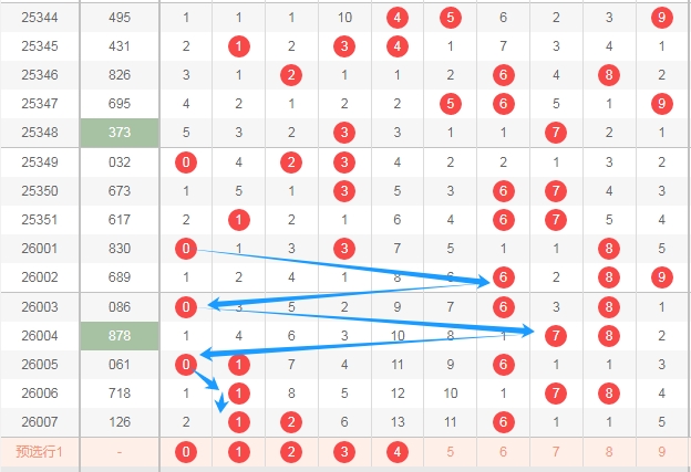 上图是体彩排列三开奖号码分布走势图,我在上面走势图中标注出来的数字3 4 5 9个人觉得可以关注出1个或者2个,因为这几个数字是遗漏周期大的,你们看我在上面画出来的蓝色小箭头都是遗漏周期小的,最近开出的遗漏周期小的数字太多了,那么本期这几个遗漏周期大的数字可以关注关注。