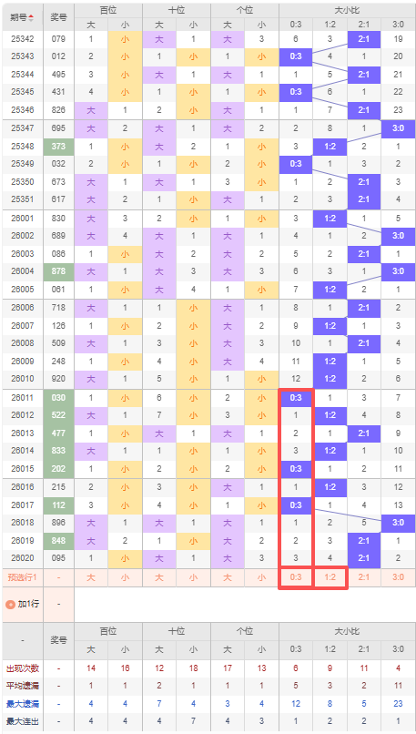 上期大小比:2:1,近10期大小比出现情况:0:3、1:2、2:1、1:2、0:3、1:2、0:3、3:0、2:1、2:1,最近10期出3期2:1,出现3期1:2,出现3期0:3,出现1期3:0,根据近10期出号规律本期推荐遗漏3期出0:3,防遗漏4期出1:2,综上所述大小比推荐:防:1:2,重点关注:0:3。