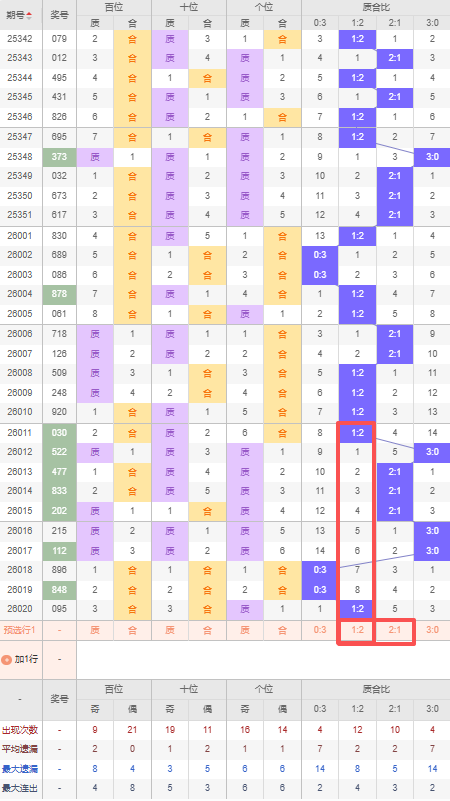 上期质合比:1:2,近10期质合比出现情况:1:2、3:0、2:1、2:1、2:1、3:0、3:0、0:3、0:3、1:2,最近10期出现3期2:1,出现2期1:2,出现2期0:3,出现3期3:0,根据近10期规律本期推荐连出1:2,防遗漏5期出2:1,综上所述质合比推荐:防:2:1,重点关注:1:2。