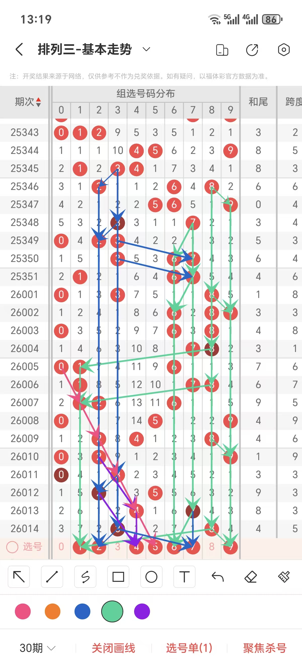 通常情况下在五期之内重复一个跨度的概率较高,近五期重复了3的跨度,近五期跨度为9/3/3/3/5,近期0路的跨度较热,本期要侧重3/5/8跨为主的号码组合。选择好跨度就可以从跨度方面选择相应的双胆码组合,双胆码的选取要根据近期和历史的走势进一步的分析选取。