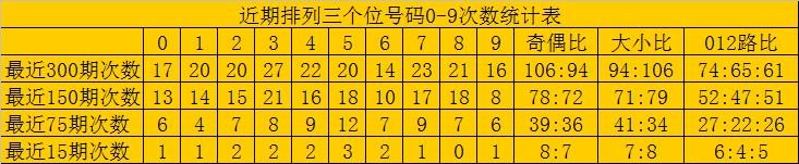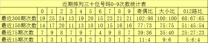 最近15期奖号由冷到热表现为:7→0次,1、3、6、9→1次,0、2、5、8→2次,4→3次,奖号奇偶比为5:10,大小比为6:9,012路比为5:4:6。