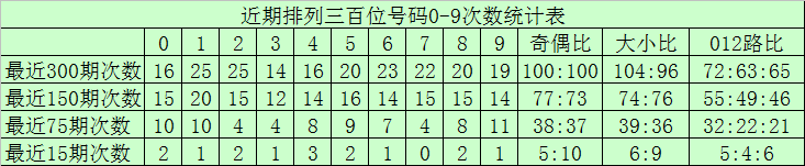 个位分析:最近300期奖号由冷到热表现为:9→22次,6→25次,0、8→26次,1、5→30次,2→31次,7→35次,4→36次,3→39次,该位号码奇偶比为156:144,大小比为138:162,012路比为112:101:87。