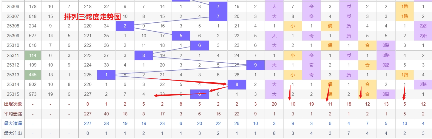 排列三 跨度分析:从上图可以看出近100期的跨度大小比约为49比51,跨度奇偶比约为47比53总体来看还是比较均衡的,但跨度大小之间有点差异。我们再从历史开出6跨后下一期3跨度数据来做参考。最近10期跨度大小比约为6:4期开出小数跨度过多返回大数跨度的概率更高一点。历史开奖近2期出6跨以后的走势为247期开出6跨后下一期走4跨走出2振幅,第265期开出6跨后下一期走3跨走出3振幅第275期开出6跨后下一期开出2跨走出4个振幅。连续多期小振幅,近期排列三跨度走势来看,2跨和4跨已持续多期未见,形成了明显的冷态格局。根据概率回补的特性,冷号在经过一段较长的遗漏后,其反弹开出的动能会显著增强,因此接下来需要对2跨和4跨的回补可能性给予足够重视。与此同时,当前热出的3跨则展现出强劲的势头,热号往往具有延续性,短期内仍有再次开出的可能,本期预计跨度遵从历史会走出小振幅,出6跨度后容易走出1到4个跨度振幅的对称形态,跨度走出1到4个振幅看好的跨度有2347跨,所以第2025316期排列三跨度推荐2347跨。本文由一起彩钱是生命动力所著,请勿转载