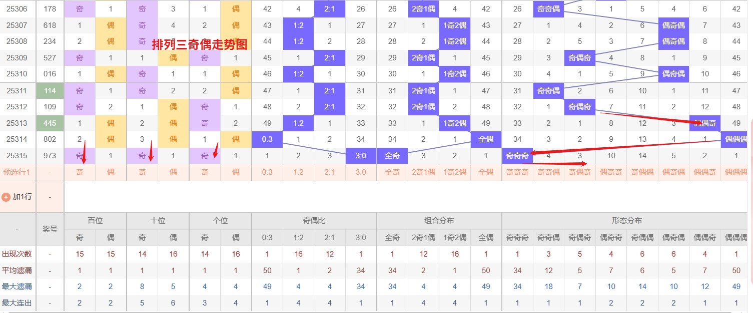 排列三 奇偶分析:从上图可以看出排列三100期内百位奇偶比约为54比46,十位奇偶比为47比53,个位奇偶比为49比51,个位的比值比较均衡,但是百位的比值偏差就有点大,历史奇偶形态近2期开出奇奇奇后下一期的走势为,第234期开出奇奇奇后235期开偶奇奇, 第248期开出奇奇奇后第249期继续开奇奇奇,第255期开出奇奇奇后第256期开奇偶奇,近期的排列三奇偶走势观察,“奇奇奇”组合虽然刚刚开出,但值得注意的是,它在开出前经历了漫长的遗漏,这次开出很可能不是孤例,更像是一次强势的冷态启动;根据冷号解冻的规律,这种长期隐匿后的首次出现,往往预示着其热度的回归,后续极有可能形成连开态势,与此同时,“奇偶奇”作为近期反复出现的热号组合,其强势状态具有明显的延续性,短期内丝毫没有转冷的迹象,同样是需要重点防范的对象。所以排列三2025316期奇偶形态推奇偶奇与奇奇奇。本文由一起彩钱是生命动力所著,请勿转载