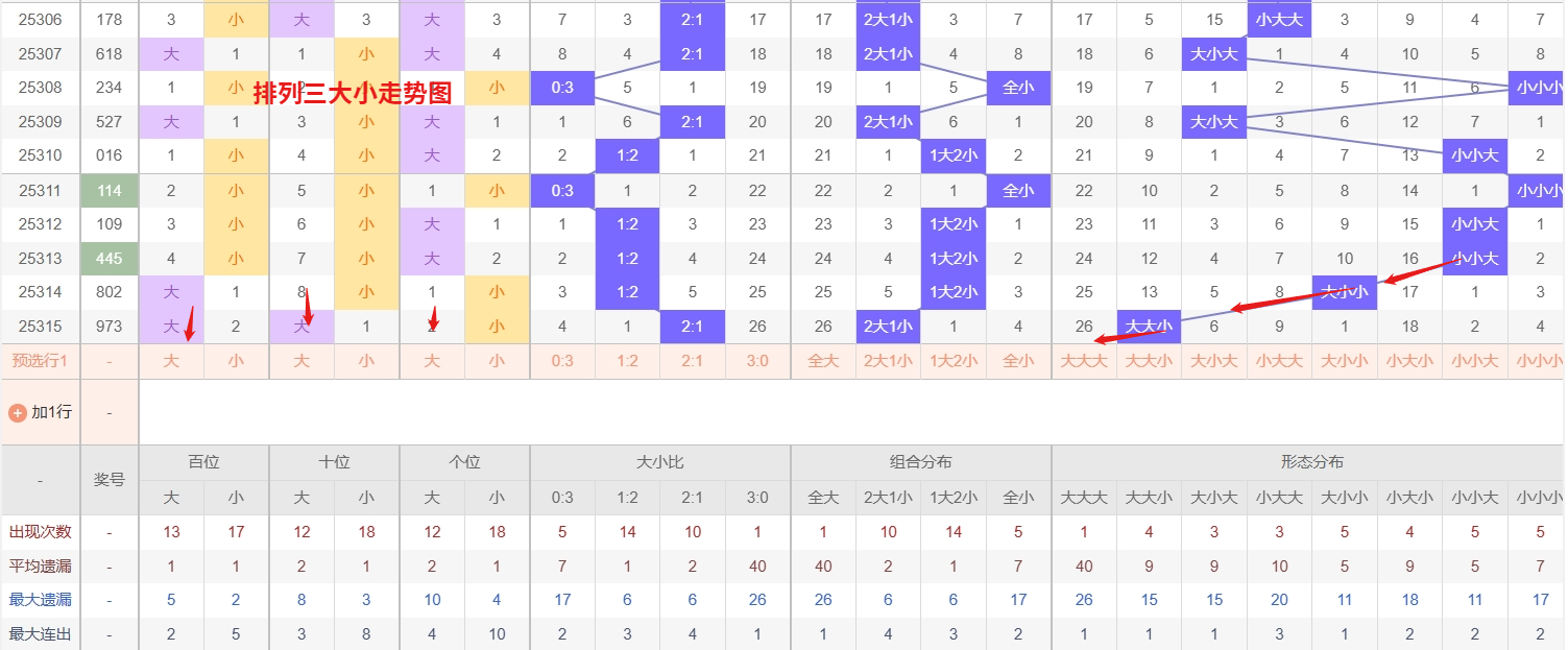排列三 大小形态分析:从大小走势图上可以看出排列三100期内百位大小比约为54比46,十位大小比约为49:51,个位大小比约为52比48,除了个位和百位奇数比偶数多,十位是偶数比奇数多。历史数据近2期开出大大小下一期的走势为,第244期开出大大小第245期开小大小。第256期开出大大小后第257期开小小大,第263期开出大大小后264期开大大大。近期排列三大小走势分析,“大大大”组合已持续多期遗漏,形成了显著的冷态,根据概率均衡与回补特性,这种长期隐匿的冷号其反弹动能正在不断累积,近期极有可能出现回补,值得重点关注。与此同时,“小大小”与“小小大”作为当前热出的两大形态,呈现出强劲的持续势头,热号路径往往具有一定的惯性,短期内仍有较大概率继续开出,须予以严密防范。综合来看,当前盘面呈现出“冷号欲破”与“热号延续”并存的格局,采取冷热兼顾的策略,在捕捉“大大大”冷态回补机会的同时,也要警惕“小大小”和“小小大”热态的进一步发展。所以排列三第2025316期大小形态推荐大大大防小小大。本文由一起彩钱是生命动力所著,请勿转载