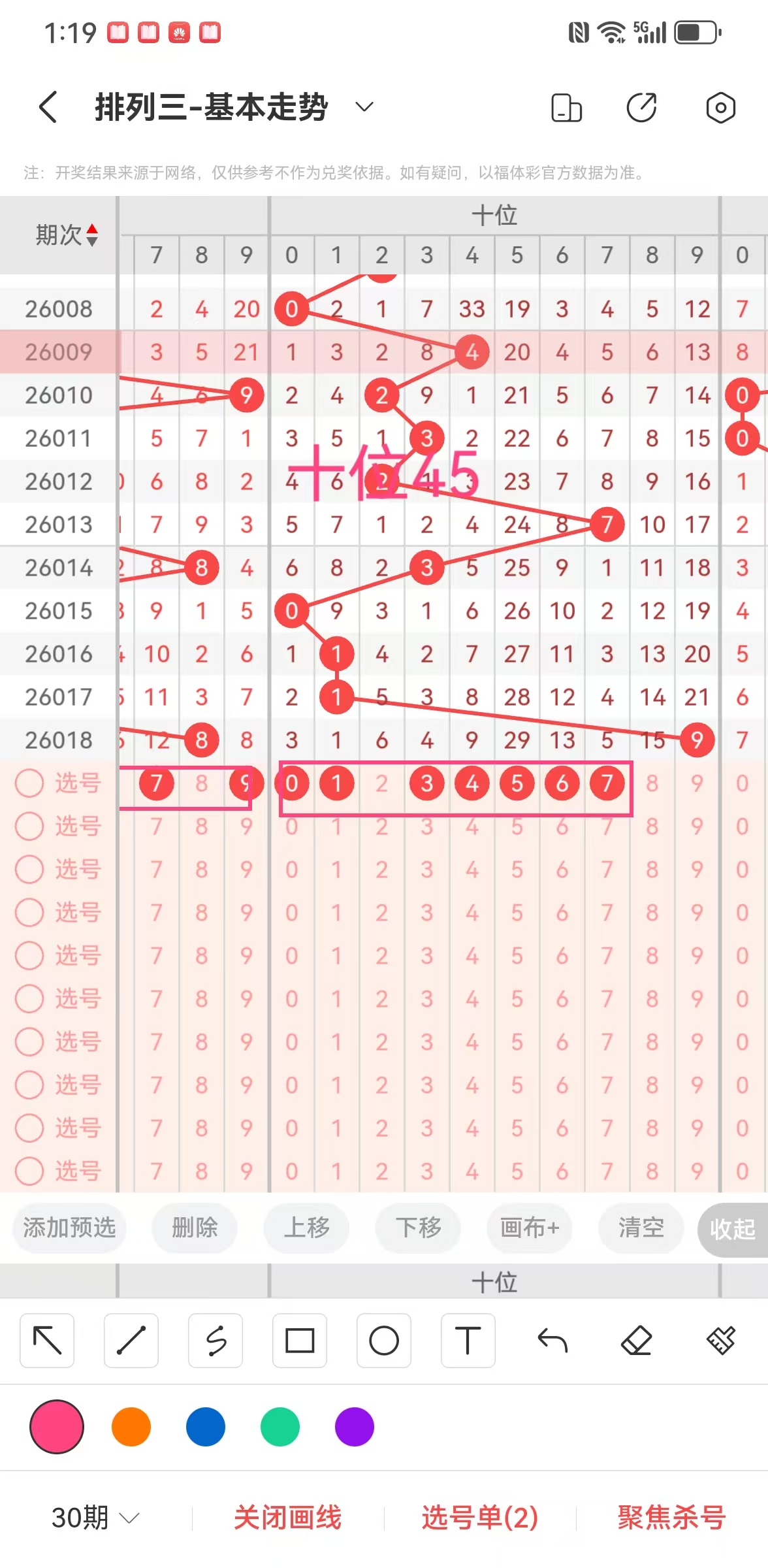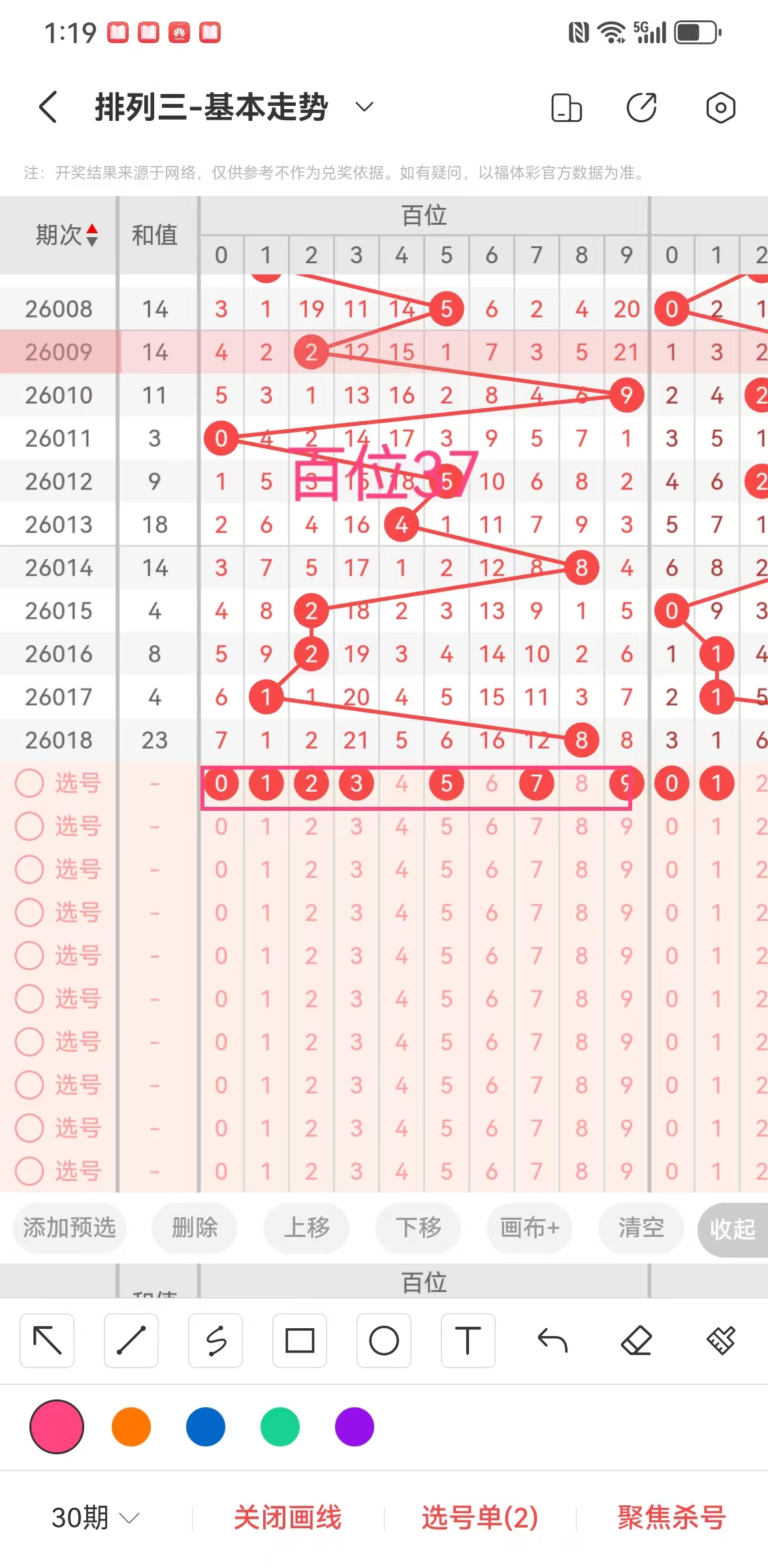 ①个位奇偶比:近5期奇偶比2:3,奇数依次开出357,奇数中大2:1,偶数依次开出22,偶数中大小比为0:2,通过对比分析得出(04689)有可能开其一