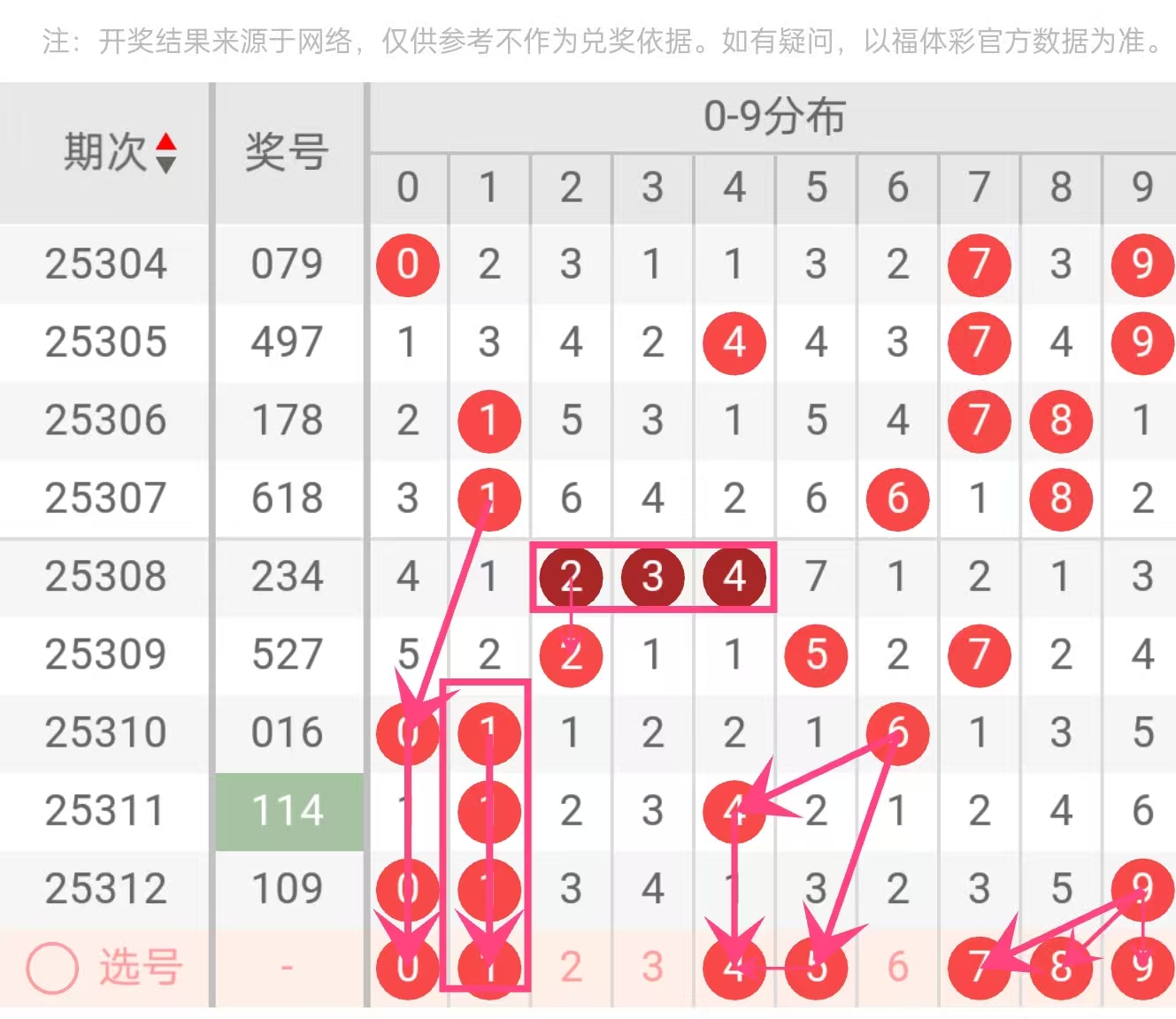 理由:数字0在近5期出现2次(2025-11-22和2025-11-20),作为重复号的可能性较高。从重复号规律看,上期开出的数字在下一期重复出现的概率约为30%,尤其0在十位和百位均有出现,显示其活跃性。同时,0属于小数字(0-4),近5期小数字出现频率较高(占70%),0可能继续维持小数字的主导趋势。此外,从和值角度,近5期和值分别为10、6、7、14、9,平均和值9.2,0作为低值数字,有助于和值稳定在较低区间,因此下期开出概率大。