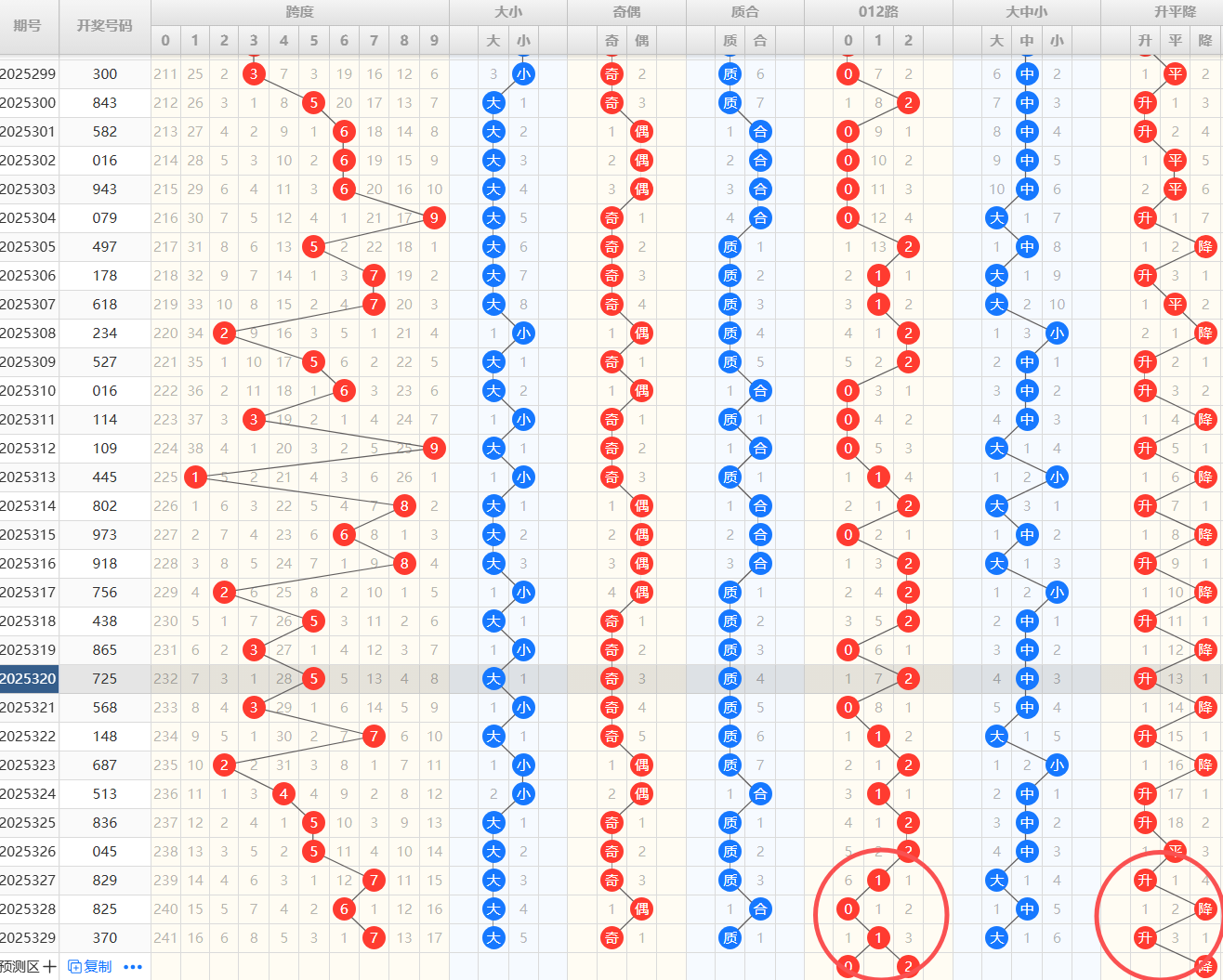 上期的开奖号码是010的直选路数组合,历史开出010后下一期开过:012/111/010/101/001/120/011/002/110/等本期关注包含1路号码的组合01/12/012防守111