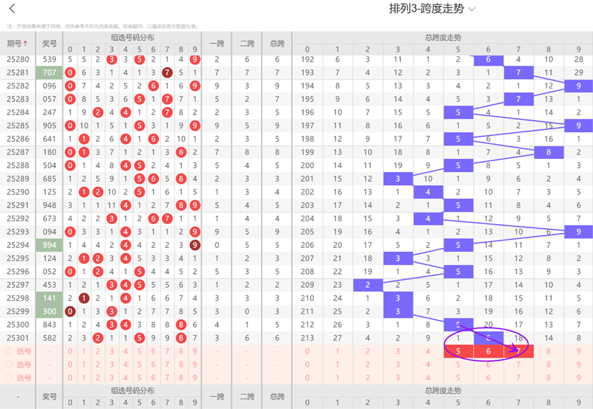 通过观察跨度及跨度属性走势可以发现:近10期内跨度较少开出01等号码,本期跨度开出01等号码的可能性较小;因此本期跨度选号时应该优先排除01等号码,再结合上述走势图看,本期跨度看好567等号码。