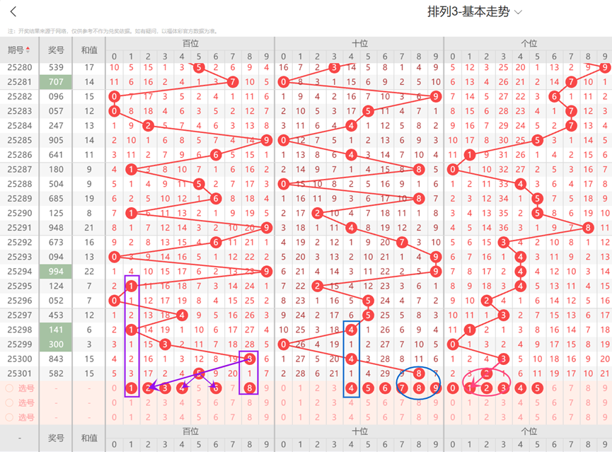上一期百位开出号码为5,为奇数、大数、质数、2路号码:近10期百位79等号码较少出号,本期百位开出79等号码的可能性小,因此本期百位选号时可以优先排除79等号码,结合上述走势图看,本期百位看好123458等号码。