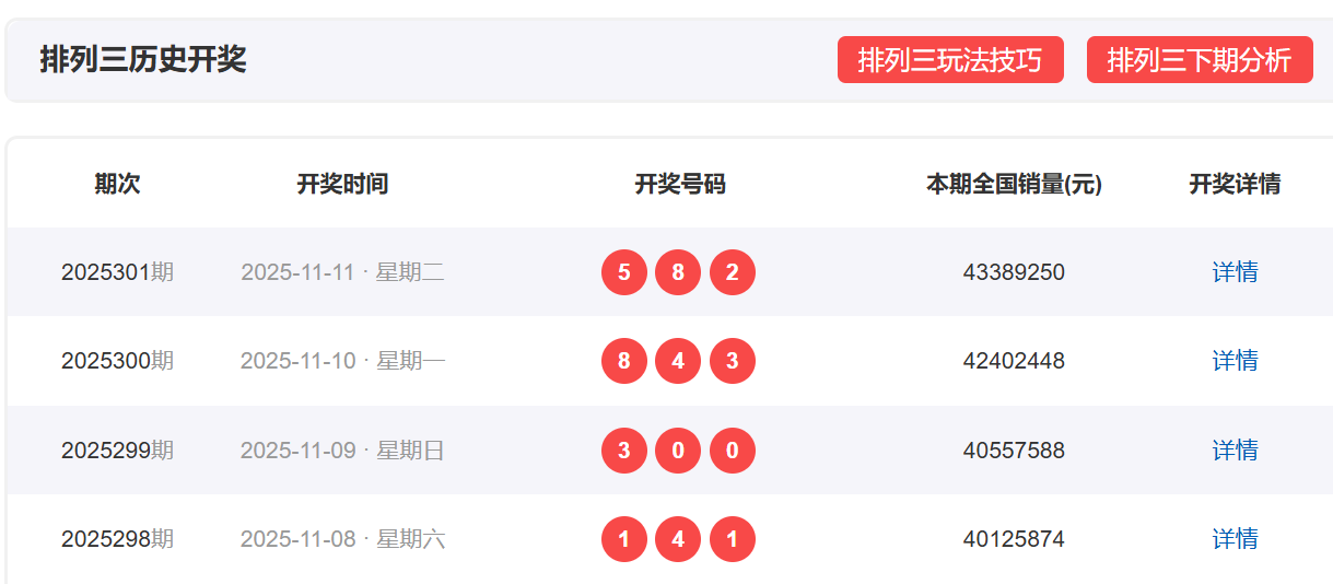 体彩排列3上一期,开奖号码为582,形态为组六,奇偶比为1:2,012路数值表现为222,和值15,和尾5,跨度5。
