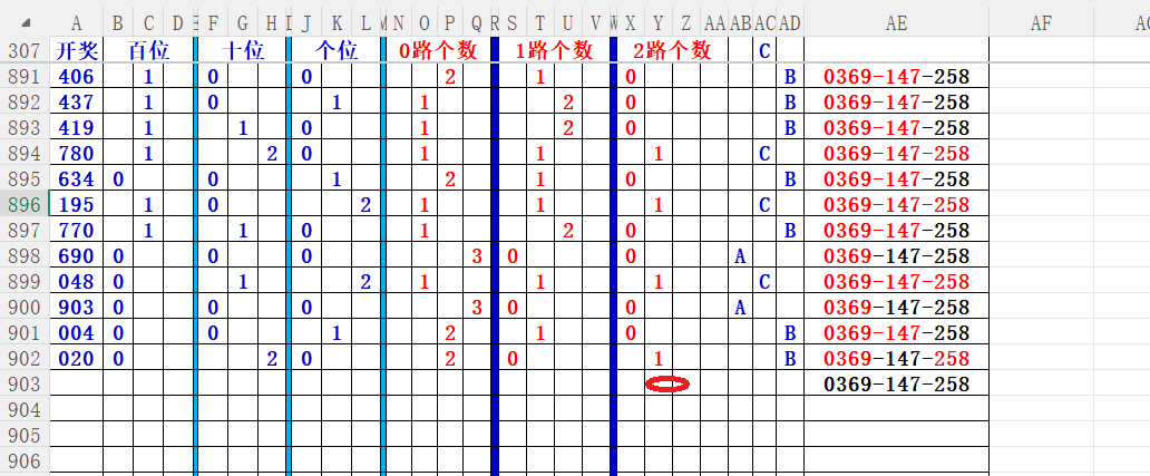 如上图56,012路分析0路出号的概率还是很大,本期可以0路号入手做胆0369中选;看好369胆码