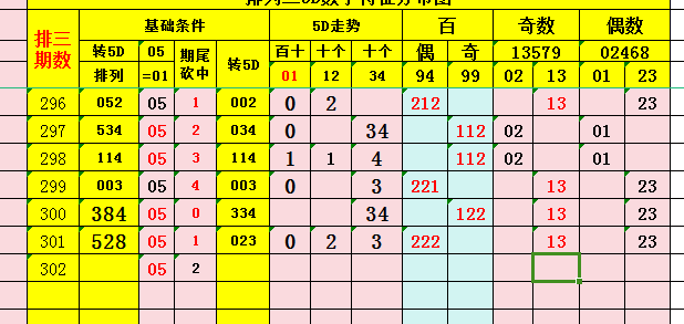 其三,划定两个常数组,奇数组 13579 按 02-13 开号规律统计,偶数组 02468 按 12-03 开号规律统计。结合往期开奖数字,构建走势图表如下: