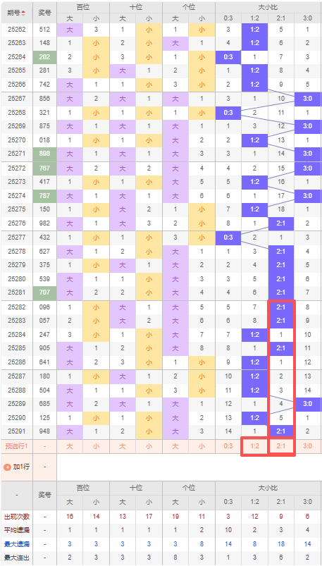上期大小比:2:1,近10期大小比出现情况:2:1、2:1、1:2、2:1、1:2、1:2、1:2、3:0、1:2、2:1,最近10期出4期2:1,出现5期1:2,出现0期0:3,出现1期3:0,根据近10期出号规律本期推荐连出2:1,防隔期开出1:2,综上所述大小比推荐:防:1:2,重点关注:2:1。