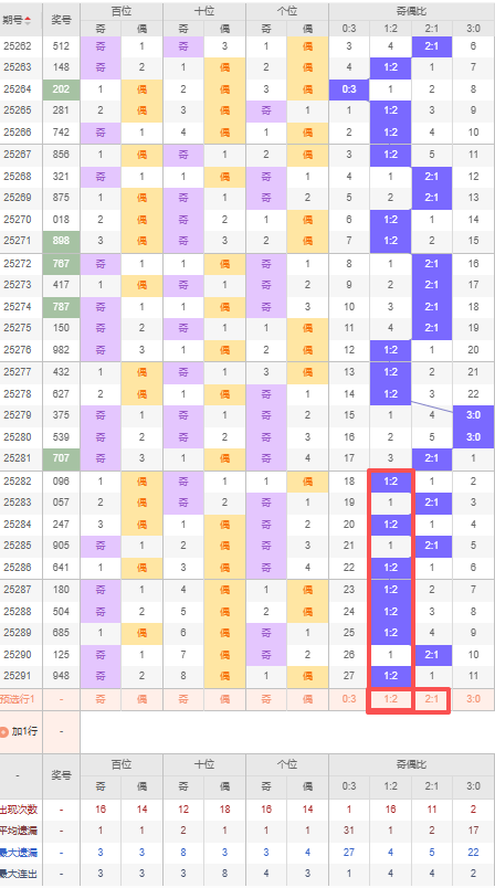上期奇偶比:1:2,近10期奇偶比出现情况:1:2、2:1、1:2、2:1、1:2、1:2、1:2、1:2、2:1、1:2,最近10期出现3期2:1,出现7期1:2,出现0期0:3,出现0期3:0,根据近10期出号规律本期推荐看好连出1:2,防隔期开出2:1,综上所述奇偶比推荐:防:2:1,重点关注:1:2。
