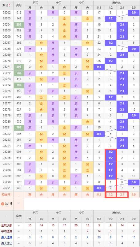 上期质合比:0:3,近10期质合比出现情况:0:3、2:1、2:1、1:2、1:2、1:2、1:2、1:2、3:0、0:3,最近10期出现2期2:1,出现5期1:2,出现2期0:3,出现1期3:0,根据近10期规律本期推荐遗漏2期的1:2,防遗漏7期的2:1,综上所述质合比推荐:防:2:1,重点关注:1:2