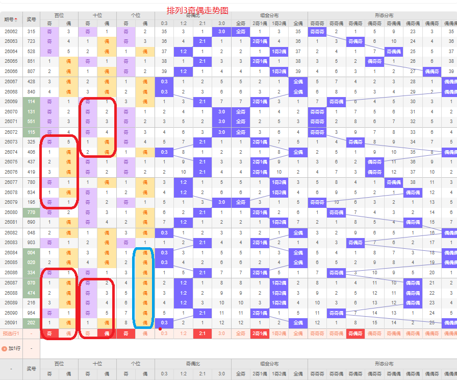 上一期的奇偶比为0:3,全偶的号码组合,从近五期的奇偶数出现情况看,奇数出5次,偶数出现10次,奇数号码出现较少,本期要侧重两偶的号码组合,侧重偶偶奇或奇偶奇的号码组合,根据奇偶组合形态可做五码定位02468/02468/13579或13579/02468/13579