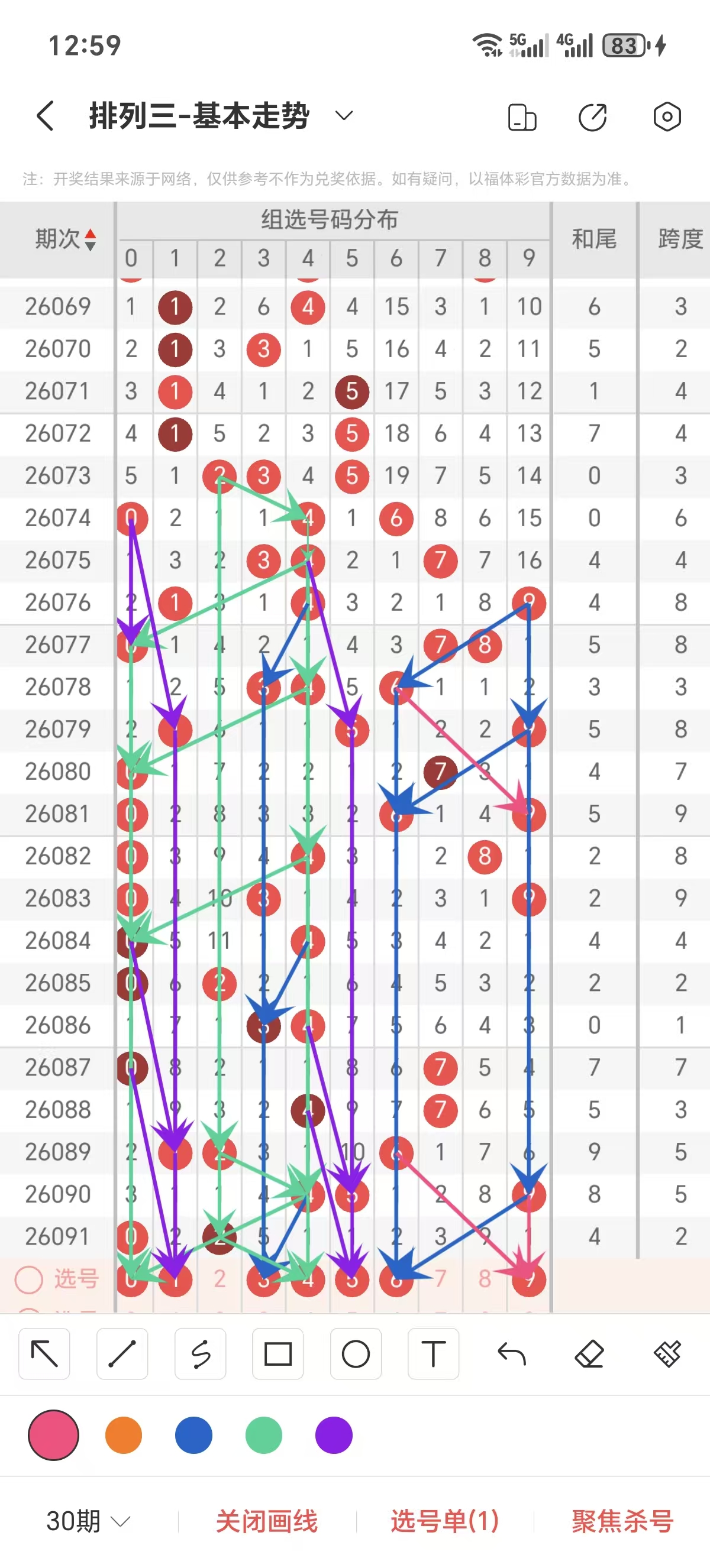 通常情况下在五期之内重复一个跨度的概率较高,近五期重复了5的跨度,近五期跨度为7/3/5/5/2,近期2路的跨度较热,本期要侧重3/4/5跨为主的号码组合。选择好跨度就可以从跨度方面选择相应的双胆码组合,双胆码的选取要根据近期和历史的走势进一步的分析选取。